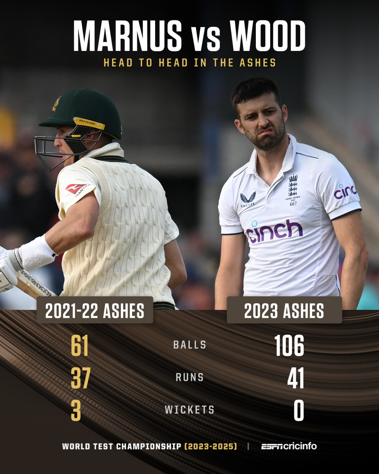 Labuschagne has been the only Australia batter to successfully negate Mark Wood across the last two Tests, a stark contrast to 18 months ago when he was dismissed by him three times in 61 balls. He was wrapped on the gloves on this abbreviated fourth day but has largely stayed in control despite Wood’s extra pace.