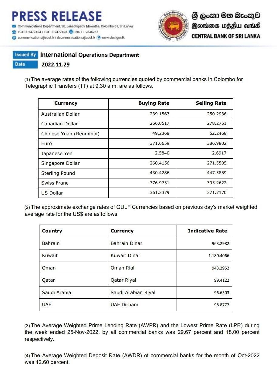 News CBSL ANNOUNCERS LATEST EXCHANGE RATES Today’s CBSL exchange rates Sunil Thenabadu Share This Previous ArticleNO POLITICAL LINKS TO CHINESE ASSISTANCE TO SRI LANKA-MFA Next Article"CHRISTMAS CARRAIGE OF HOPE" LAUNCHED AT KINGSBURY COLOMBO November 29, 2022