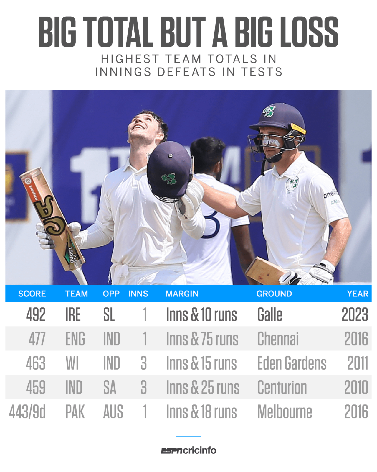 Only Harry Tector had mounted any serious resistance, batting out 189 balls for his 85, though Andy Balbirnie did also contribute a 46, despite having had to go off the field for a spell after Asitha had hit him on the helmet. Resisting Sri Lanka’s spinners on a fifth day at Galle was always going to be difficult. But Ireland will be disappointed they did not make the opposition bat again, after they had been so secure in the first innings. They were ten runs short, in the process achieving an unwanted record: the highest team total to result in an innings defeat.
