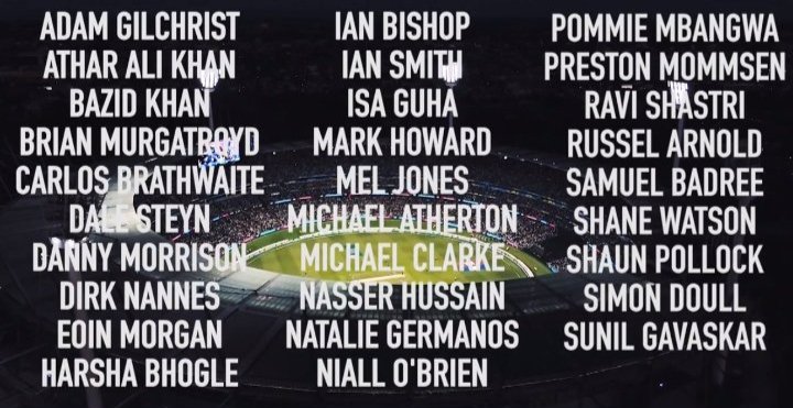 The commentary panel includes Adam Gilchrist (Australia), Athar Ali Khan (Bangladesh), Ian Bishop (West Indies), Ian Smith (New Zealand), Pommie Mbangwa (Zimbabwe), Preston Mommsen (Scotland), Ravi Shastri (India), Isa Guha (England), Bazid (Pakistan), Brian Murgatroyd (Netherlands), Mark Howard (Australia), Russell Arnold (Sri Lanka), Carlos Brathwaite (West Indies), Mel Jones (Australia), Samuel Badree (West Indies), Dale Steyn (South Africa), Michael Atherton (England), Shane Watson (Australia), Danny Morrison (New Zealand), Michael Clarke (Australia), Shaun Pollock (South Africa), Dirk Nannes (Dutch), Nasser Hussain (England), Simon Doull (New Zealand), Eoin Morgan (England), Natalie Germanos (South Africa), Sunil Gavaskar (India), Harsha Bhogle (India), and Niall O’Brien (Ireland).