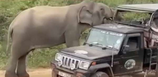 A wild elephant in Yala National Park toppled a safari jeep carrying tourists in a dramatic encounter captured on video.