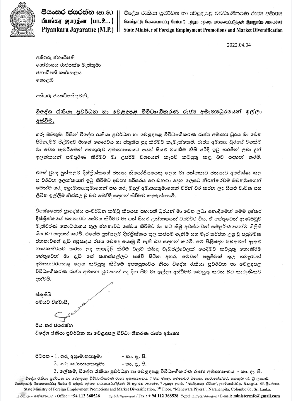 The resignation of Piyankara Jayaratne from his post as the State Minister of Foreign Employment Promotion and Market Diversification has not been accepted by the President Gotabaya Rajapaksa, President Media Division announced.